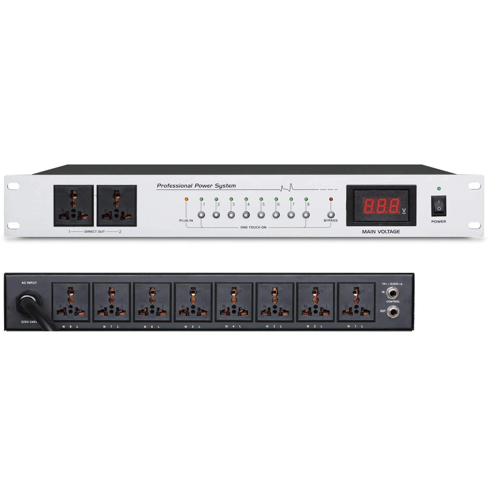 - 电源插座:后面板8个16A万用插座,1-4路带滤波功能,前面板2个直通16A万用插座
