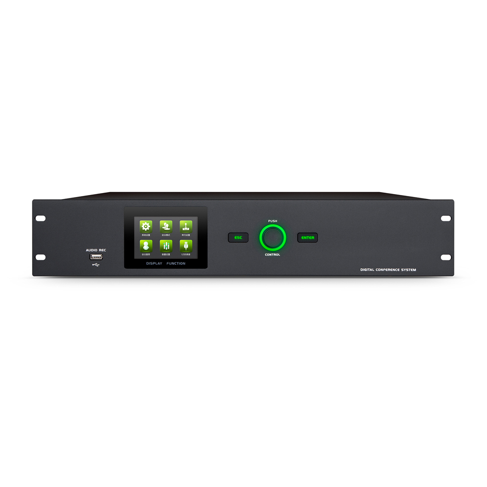 • 采用3.5寸全视角IPS彩色显示屏,直观显示和方便调节系统的各项参数 • 支持USB录音,高保真WAV格式输出 • 具有3组共6路RJ45的话筒单元接口,采用闭环以太网链接模式 • 支持话筒单元的双边供电,且支持话筒单元热插拔,每路支持20个单元,可接60个单元 • 同时具有4路8芯话筒单元接口,每路支持25个单元,可接100个单元 • 单台主机通过扩展电源最多可接256台会议单元,亦可通过会议扩展主机(手拉手串联),一套会议系统最多可接入达1200台会议单元 • 系统具备会议服务功能,发言单元可申请茶水、纸笔、帮助等服务 • 具有USB接口,可连接电脑对主机进行操作设置