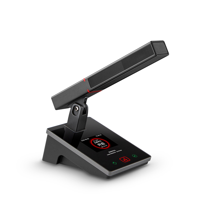 • 金属面板设计,整体高档庄重,符合现代审美标准 • 专业高保真电容咪芯,拾音灵敏、语音清晰,带宽达到20Hz~20KHz • 采用铝合金方形麦克风,通过固定接头连接话筒底座,可调俯仰角度 • 话筒头部带双色发言灯环 • 单元发言时灯环为常亮红色,单元申请发言时灯环为常亮绿色 • 灵敏的触摸式开关,待机未按时图案常亮发光绿色,按下后图案常亮发光红色 • 2.4寸高亮度IPS TFT显示屏,显示内容清晰,可以显示单元参数、日期时间、发言音量、监听音量等 • 话筒带发言计时功能 • 发言单元可申请茶水、纸笔、帮助等服务 • 主席单元不受发言人数限制 • 主席单元具有全权控制会议秩序的优先功能