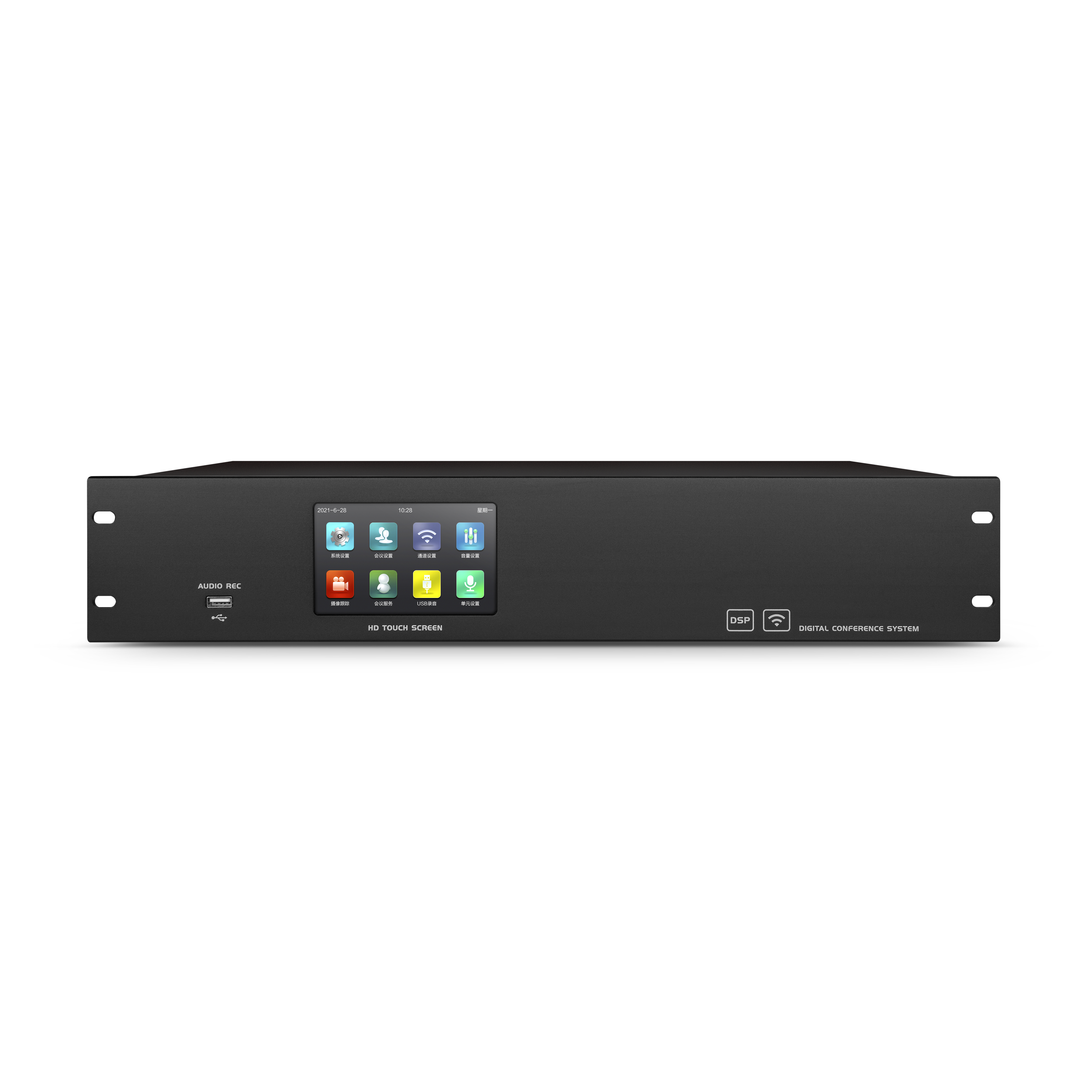 • 采用全数字会议技术,基于数字网络架构开发,内置高性能CPU处理器,处理速度更快,音质更佳,支持讨论、视像跟踪功能 • 采用FM调频传输音频,配合高还原电路及防啸叫设设计,加上采用新型防啸叫单指向高灵敏度电容咪芯,使会议声音音质实现高保真度还原 • 采用4.3寸全视角IPS电容触摸屏,直观显示和方便调节系统的各项参数 • 支持USB录音,高保真WAV格式输出 • 主机具有20组固定的频率通道,可在同一场所使用多套无线系统,也可避免与会场其他无线产品的互相干扰 • 每套系统可支持200个无线会议单元,同时发言人数可设定为1-6人,最大支持6个主席同时发言 • 兼容有线会议单元同时使用,支持话筒单元热插拔 • 具有多种会议模式: FIFO(先进先出模式)、APPLY(申请模式)、FREE(自由模式)、LIMIT(限制模式) • 系统具备会议服务功能,发言单元可申请茶水、纸笔、帮助等服务 • 采用高性能DSP处理器对音频进行高低音调节、降噪处理,使声音清晰透彻 • 具有USB接口,可连接电脑对主机进行操作设置 • 具有警报信号输入接口
