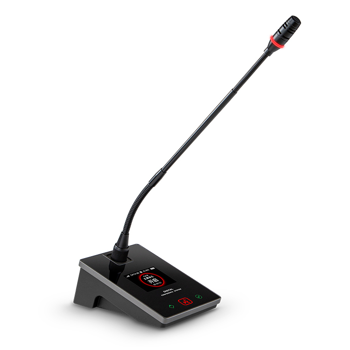 • 金属面板设计,整体高档庄重,符合现代审美标准 • 内置完全隔离的主麦克风及备份麦克风,两路音频信号同时输出 • 话筒头部带双色发言灯环,单元发言时灯环为常亮红色 • 单元申请发言时灯环为常亮绿色 • 灵敏的触摸式开关,待机未按时图案常亮发光绿色,按下后图案常亮发光红色 • 2.4寸高亮度IPS TFT显示屏,显示内容清晰 • 话筒带发言计时功能 • 侧边带机械式电子音量开关,可单独调节话筒发言音量 • 发言单元可申请茶水、纸笔、帮助等服务 • 主席单元具有批准代表的发言申请功能 • 主席单元具有全权控制会议秩序的优先功能