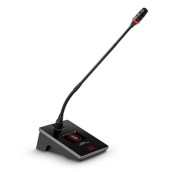 • 金属面板设计,整体高档庄重,符合现代审美标准 • 内置完全隔离的主麦克风及备份麦克风,两路音频信号同时输出 • 话筒头部带双色发言灯环,单元发言时灯环为常亮红色 • 单元申请发言时灯环为常亮绿色 • 灵敏的触摸式开关,待机未按时图案常亮发光绿色,按下后图案常亮发光红色 • 2.4寸高亮度IPS TFT显示屏,显示内容清晰 • 话筒带发言计时功能 • 侧边带机械式电子音量开关,可单独调节话筒发言音量 • 发言单元可申请茶水、纸笔、帮助等服务